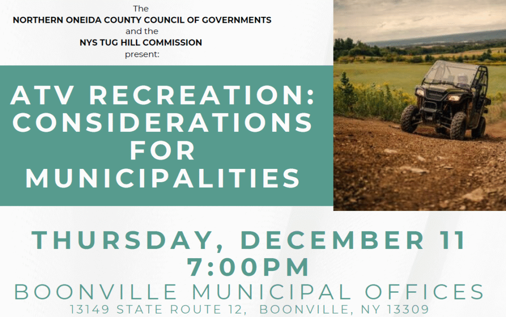The Tug Hill Commission recently published ATV Recreation: Considerations for Municipalities. Taylor McKinney, project specialist at the Tug Hill Commission and primary author of the issue paper, will walk attendees through the content, including the impetus for writing the document, the approach taken to research local laws and relevant court cases, and best practices municipalities may want to consider when opening roads for ATV recreation in their town or village. There will be plenty of time for questions and answers. The paper can be downloaded from the commission’s website at tughill.org/publications/technical-issue-papers/, or by contacting either your municipal