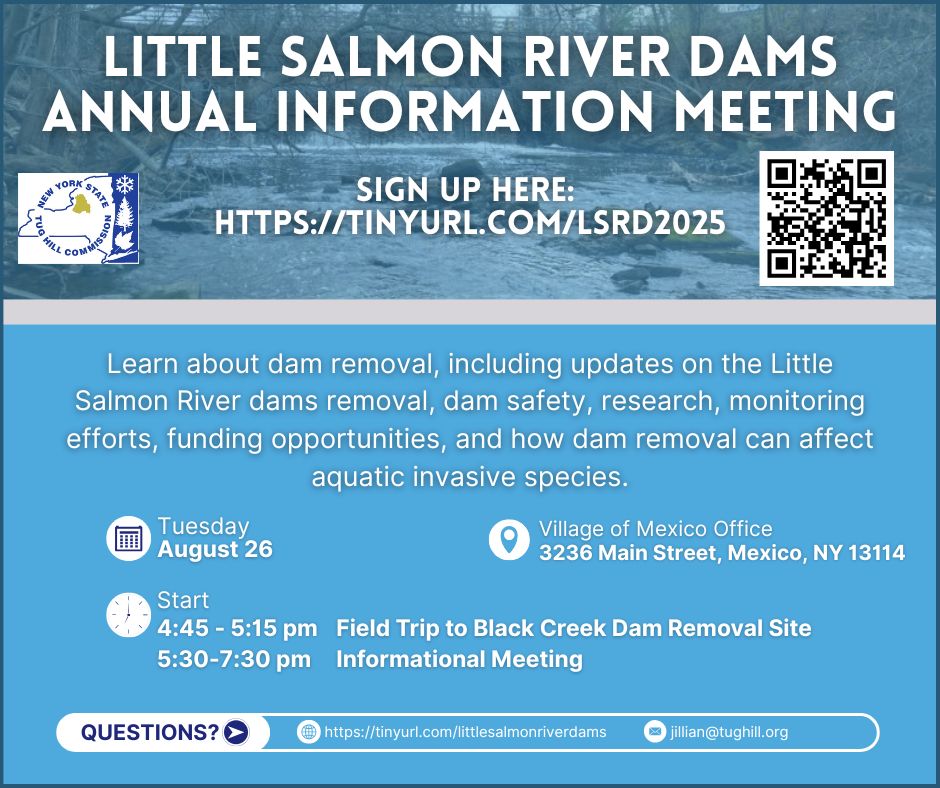 Learn about dam removal, including updates on the Little Salmon River dams removal, dam safety, research, monitoring efforts, funding opportunities and more. Register now at tinyurl.com/LSRD2025. More information at tinyurl.com/littlesalmonriverdams.